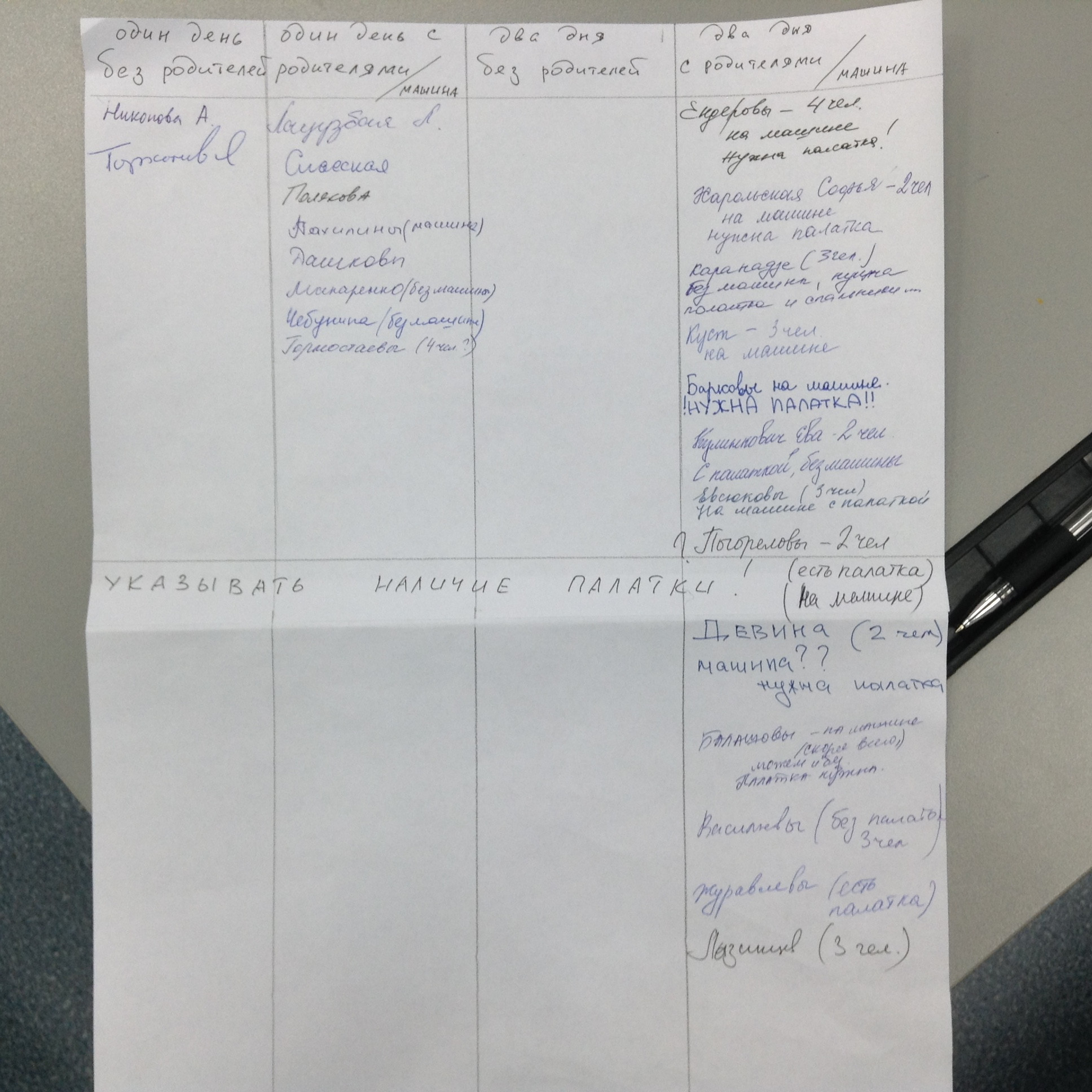 Да, Марин, я вчера как раз и хотела сказать, давайте составим меню. Чтобы понять, какая еда и в каком количестве нам нужна. Может, суп какой сварить (есть ли у кого котел на этот случай), и о завтраке надо подумать для тех, кто останется с ночевкой. Определимся со списком необходимого, тогда и решим, кто чего будет покупать.