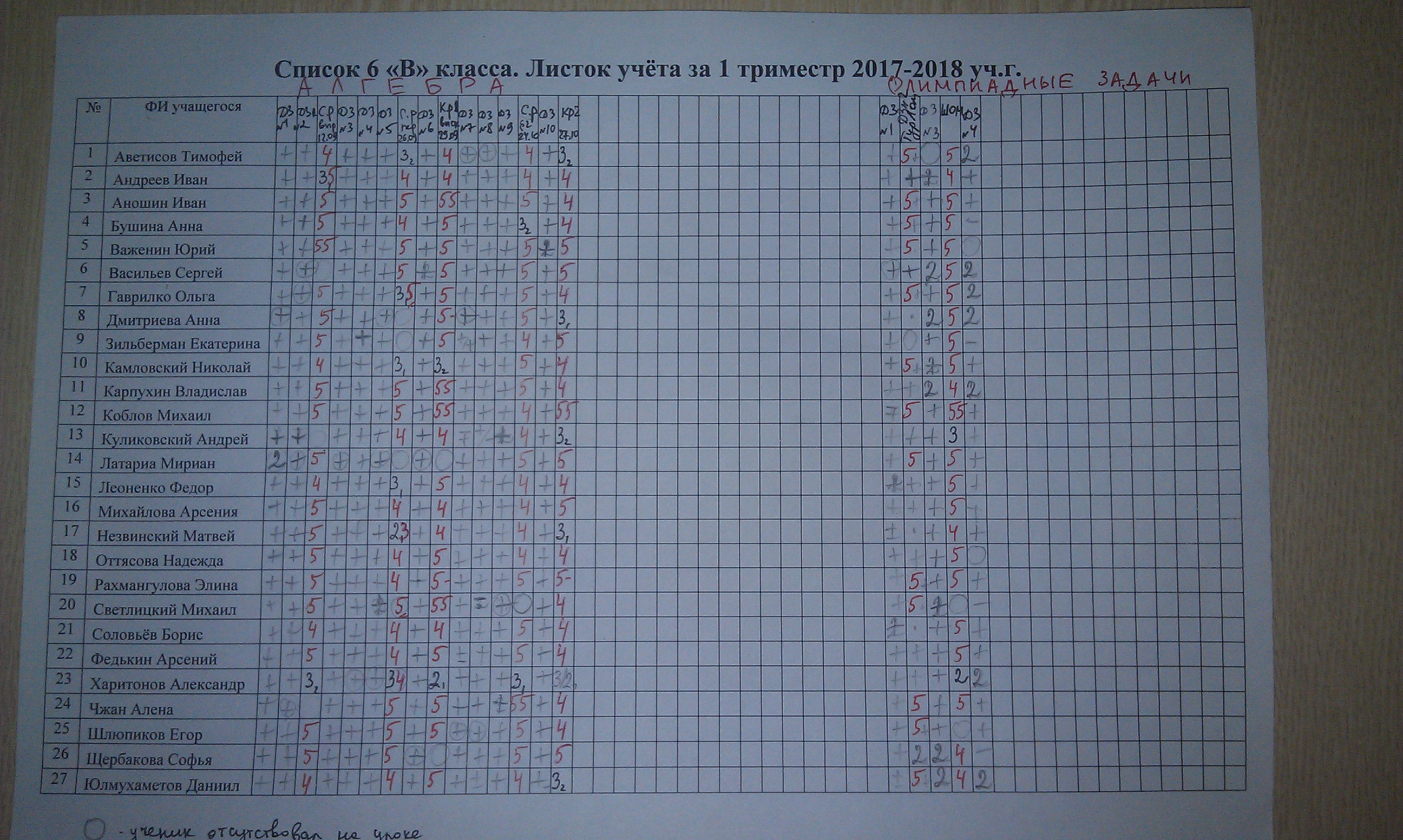 От себя добавлю, что результаты детей меня радуют: оценки очень хорошие, большинство справляется с программой успешно. Затруднения имеются у некоторых детей (это видно из таблицы), но это рабочий момент - дети стараются. 10 человек от класса прошли на окружной этап олимпиады по математике за 7 класс! 9 человек из 12 вошли в группу подготовки к Уральскому турниру матбоев.