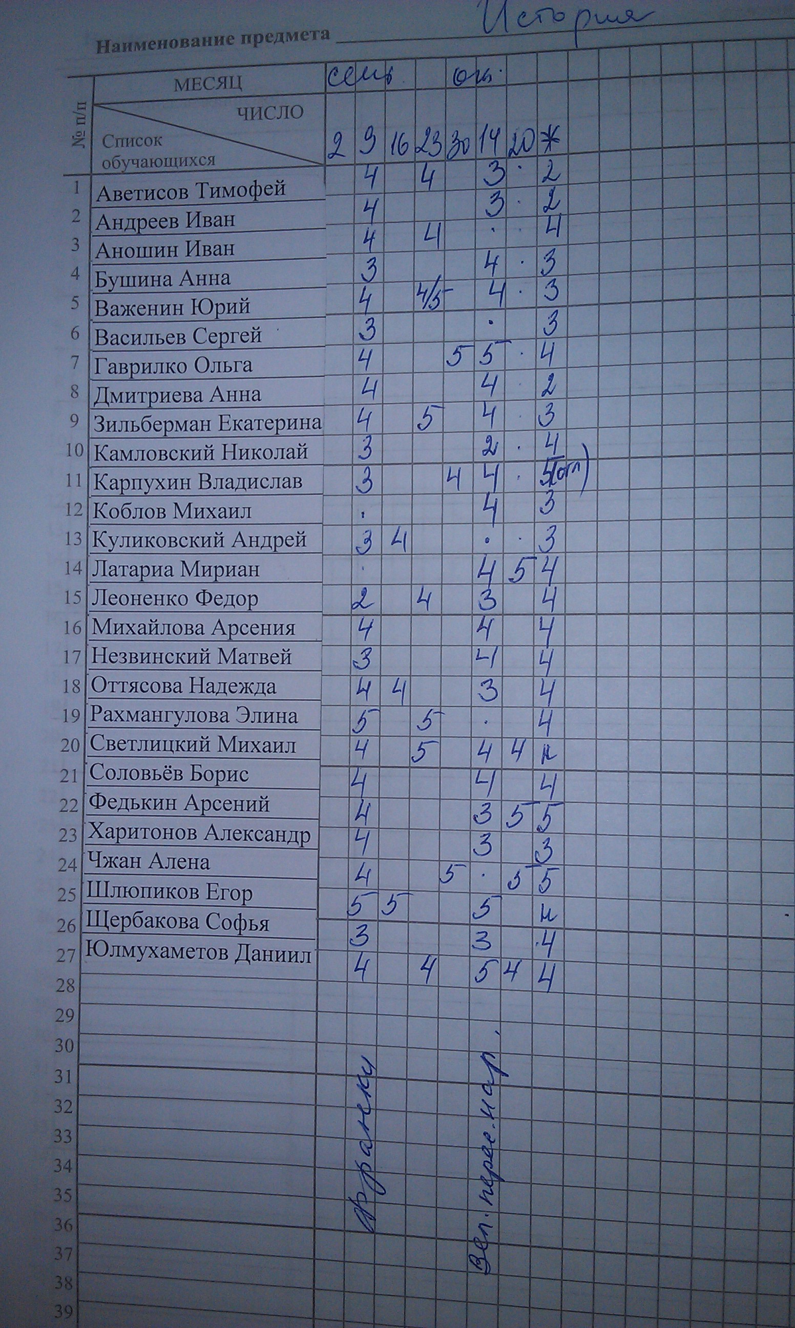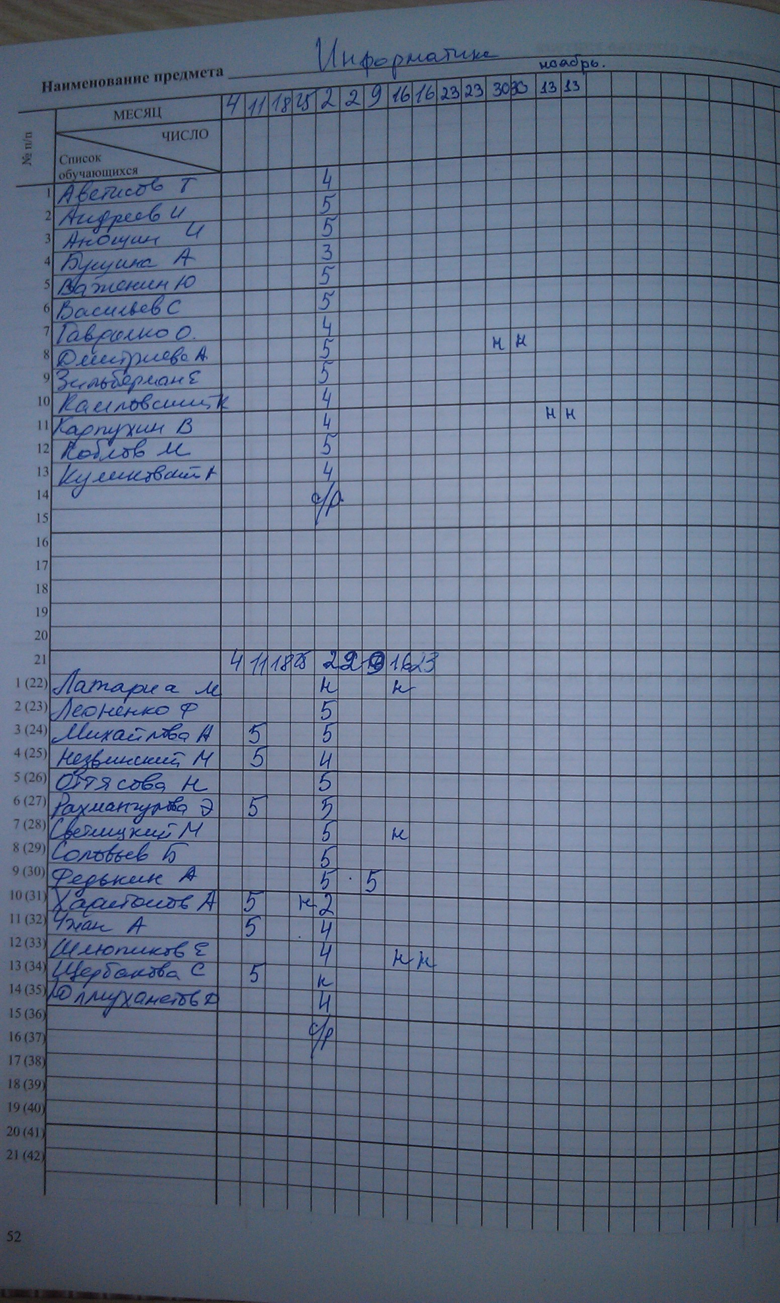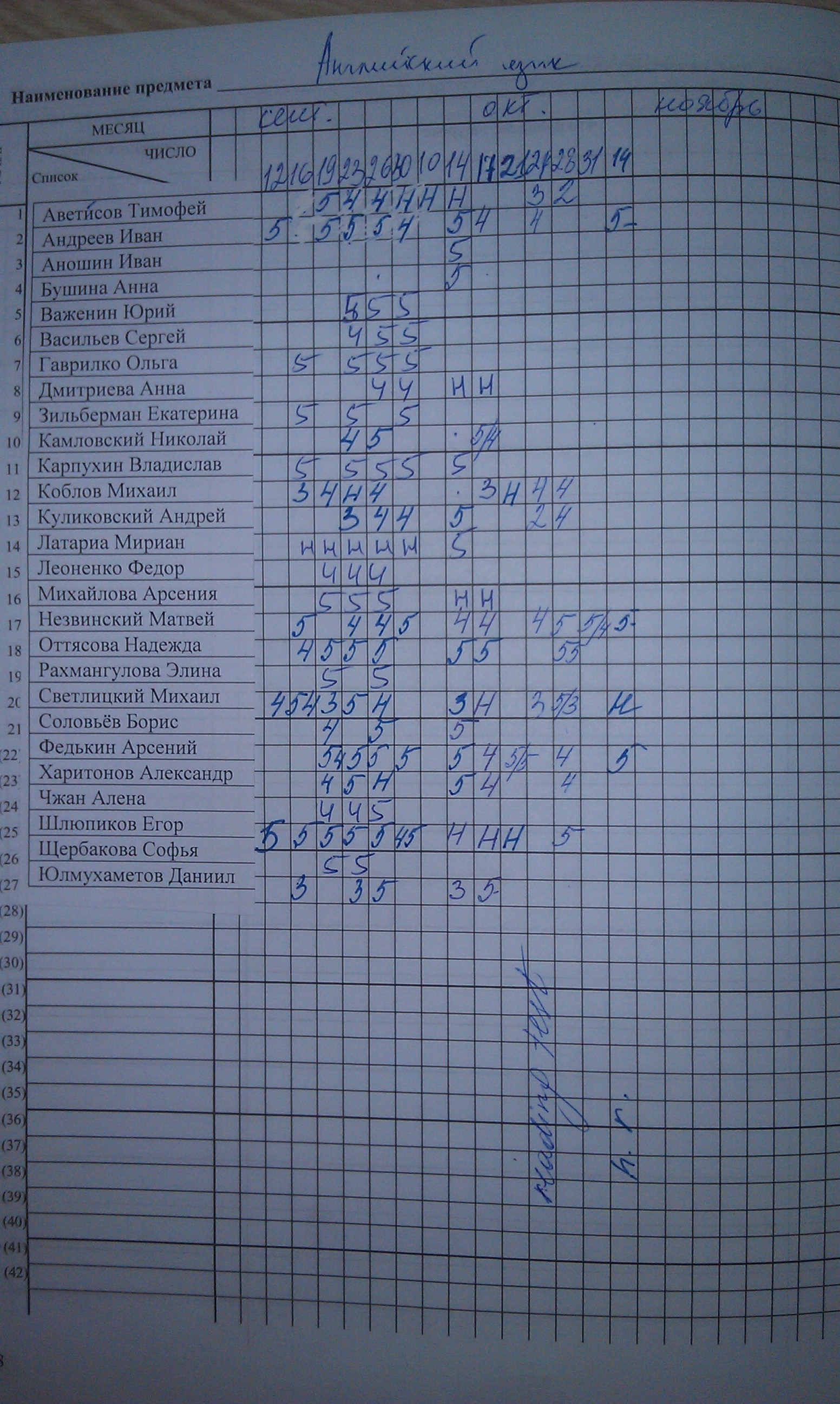 Собрал все, что есть в бумажном журнале. Остальные оценки надеюсь получить через учителей. Но, повторяю еще раз, никто из учителей с тревожными замечаниями о выходящих 2 ко мне не обращался.