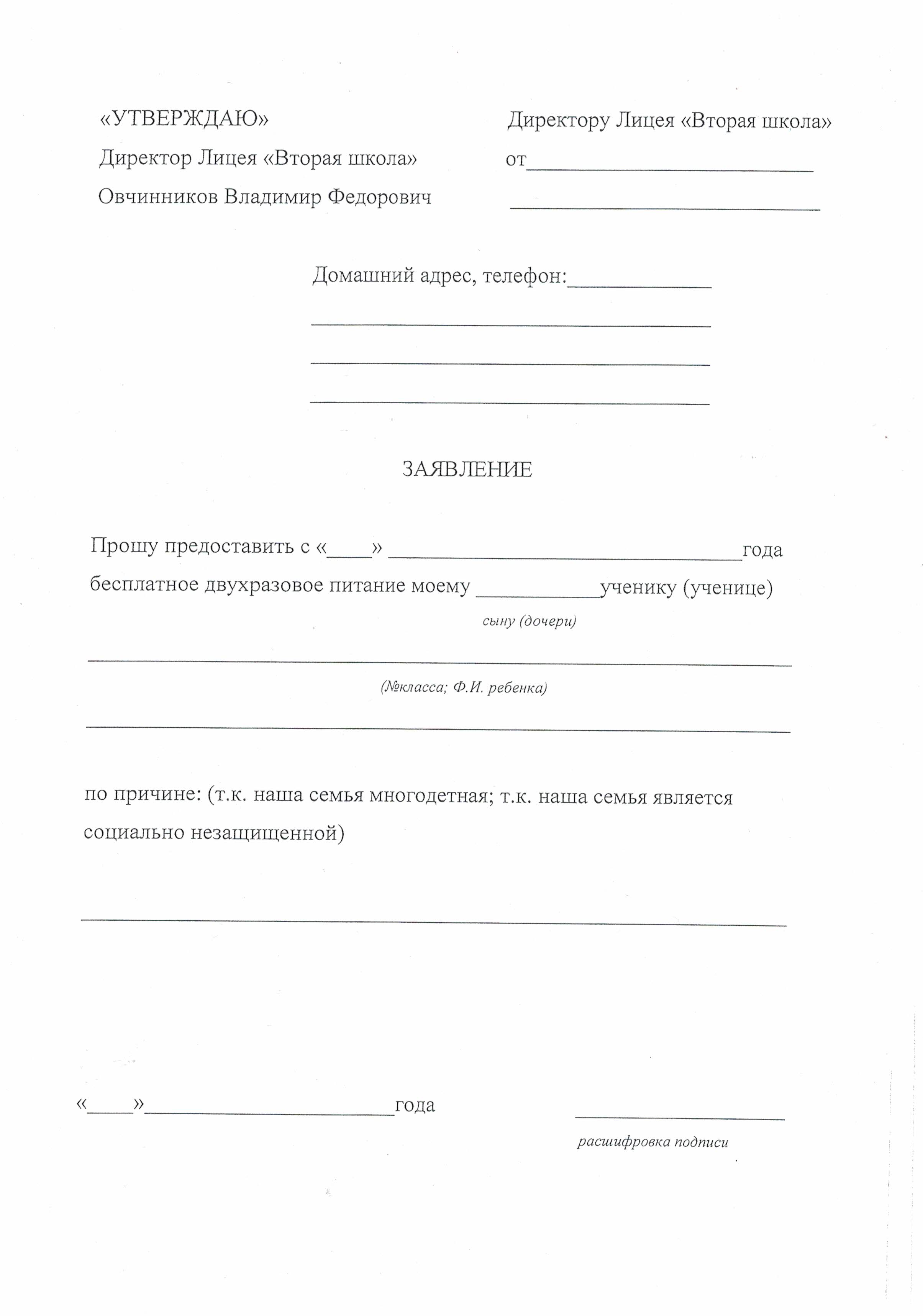 1. Заявление на бесплатное питание (прилагаю скан). Если нет возможности распечатать, напишите от руки или завтра выдам бланк ребенку.