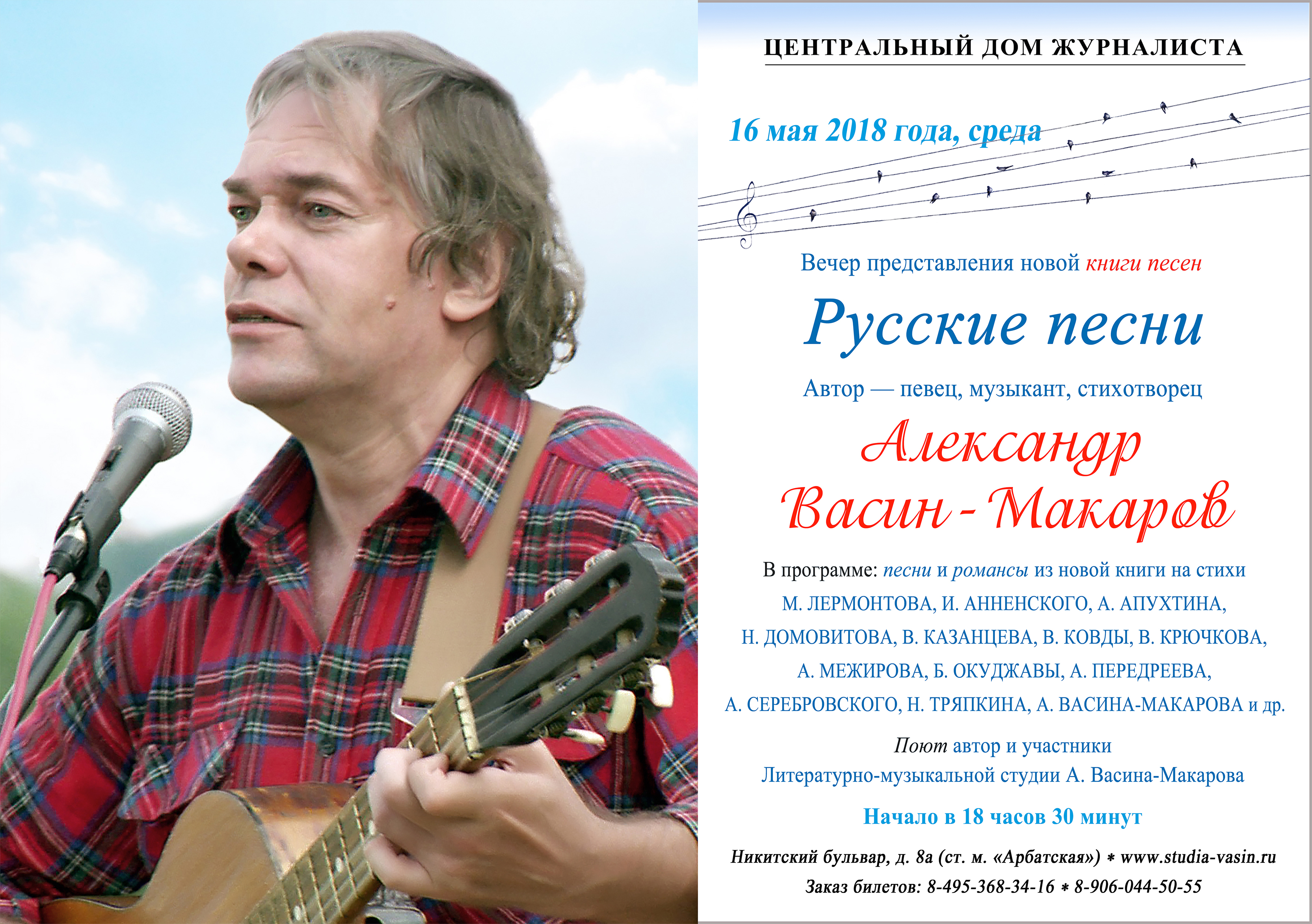 Как договаривались, размещаю информацию и еще раз приглашаю Вас на вечер Литературно-музыкальной студии Александра Васина-Макарова "Русские песни". Вечер состоится 16 мая 2018 г. в Центральном доме журналистов в 18.30.