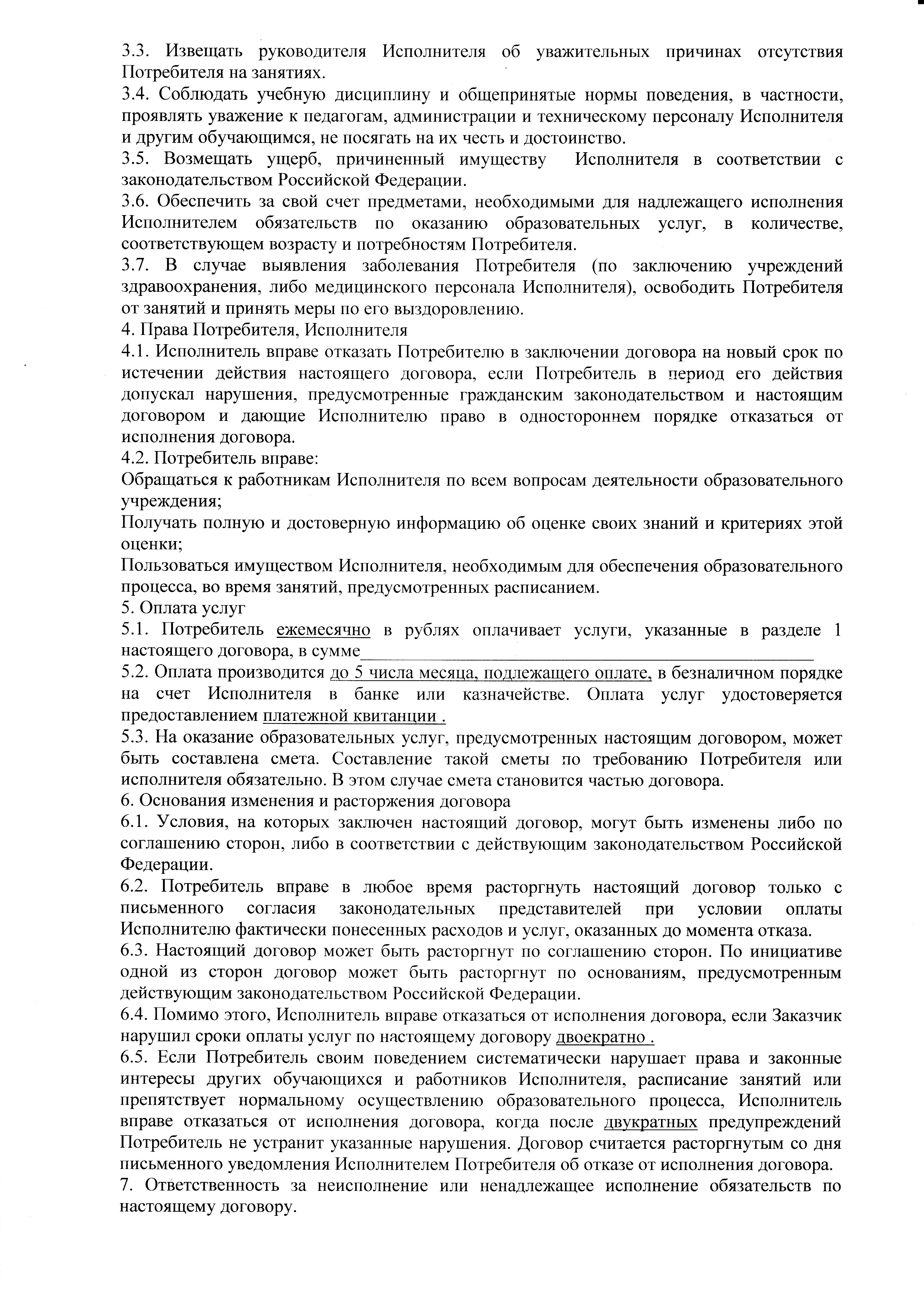 4) настоятельно рекомендую тем, кто решил временно пропустить месяц занятий, пропустил месяц занятий по уважительной причине (по болезни со справкой) или решил бросить занятия обратиться к Инсаровой Т.В. сразу же после каникул для выяснения вопроса об оплате пропущенных месяцев или для оформления расторжения договора! По договору, который Вы заключали с администрацией, Вы обязаны оплатить обучение за все месяцы до расторжения договора, кроме случаев, когда вы пропустили занятия по причине длительной болезни. Я со своей стороны могу предложить только дополнительные занятия, Вам могу посоветовать в следующий раз внимательнее читать договоры.